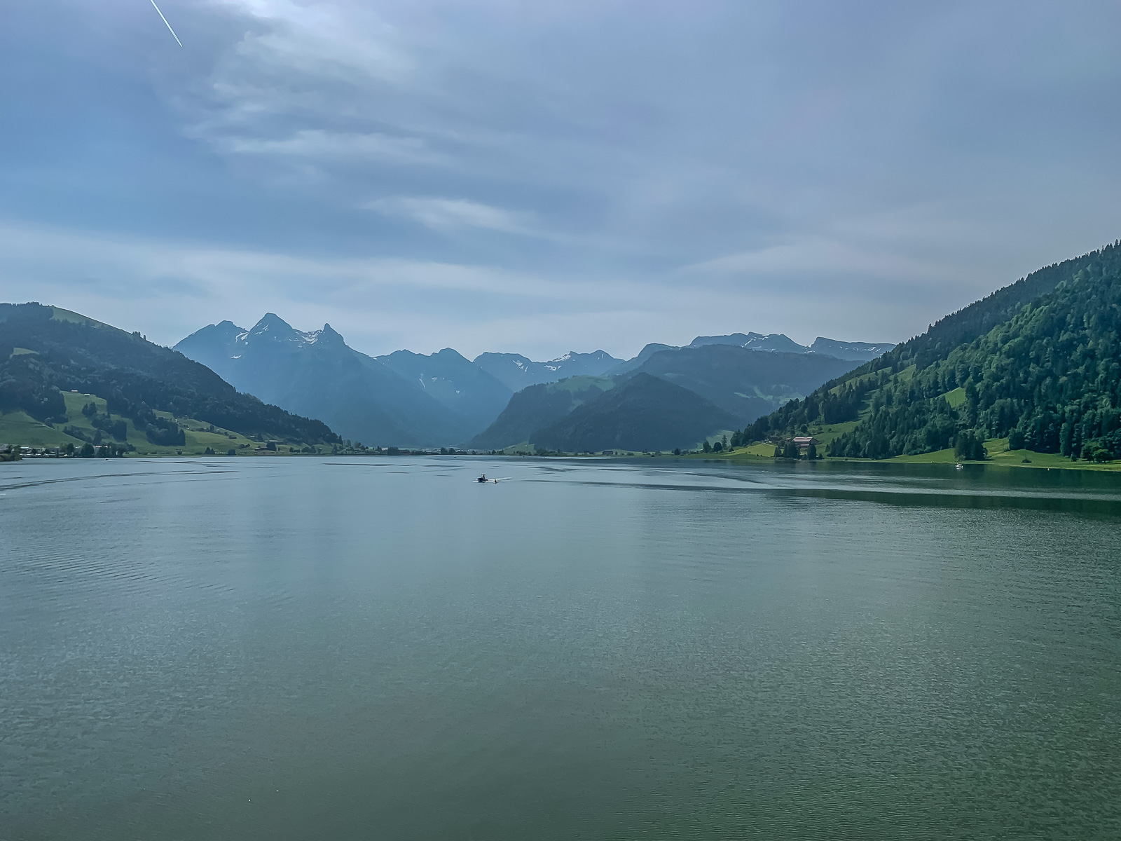 Rückblick auf den Klöntalersee rechts die Wände des Glärnisch-Massivs